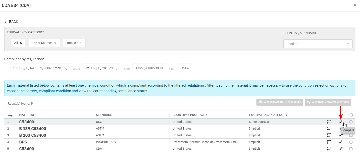 Materials generated from Equivalents finder, can be used as a replacing material or compared with the original, as well as added to the existing Compliance Assessor list or Material List Builder.